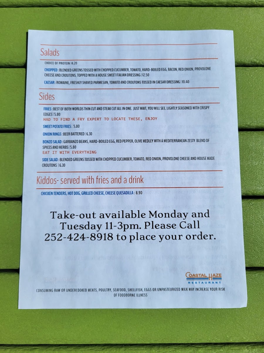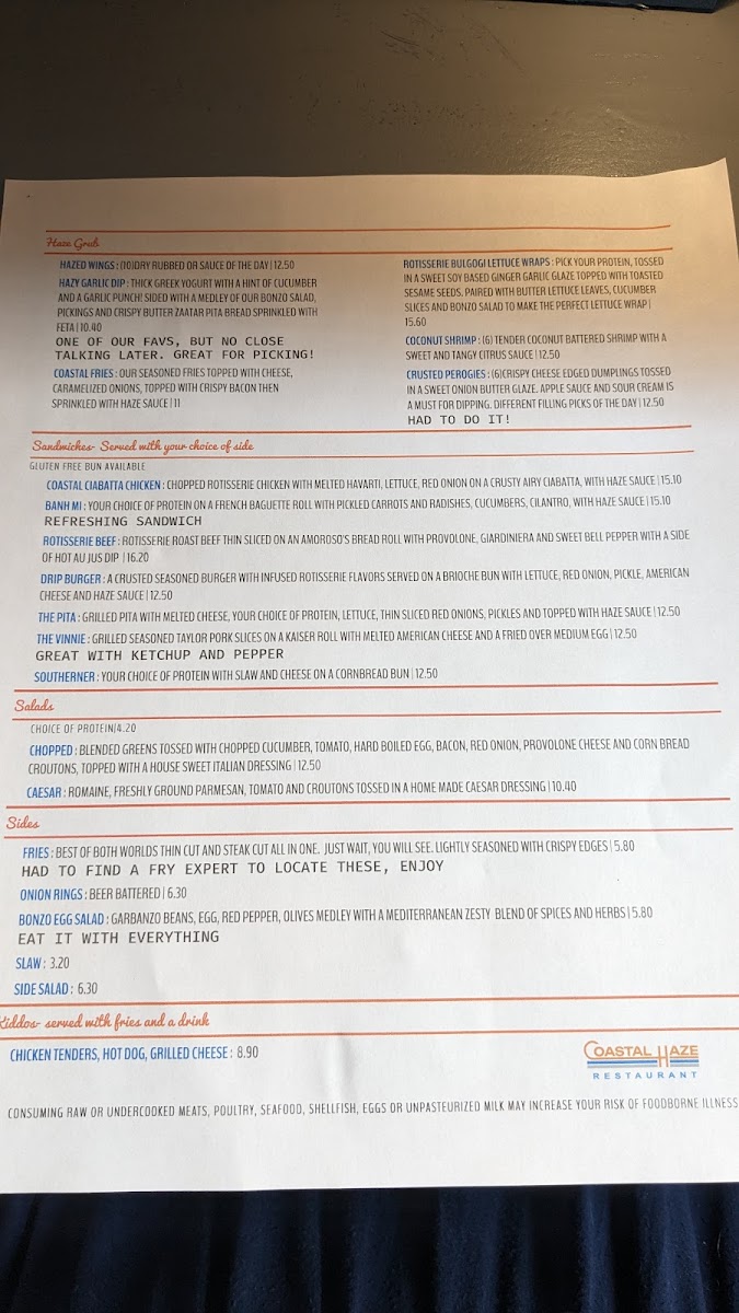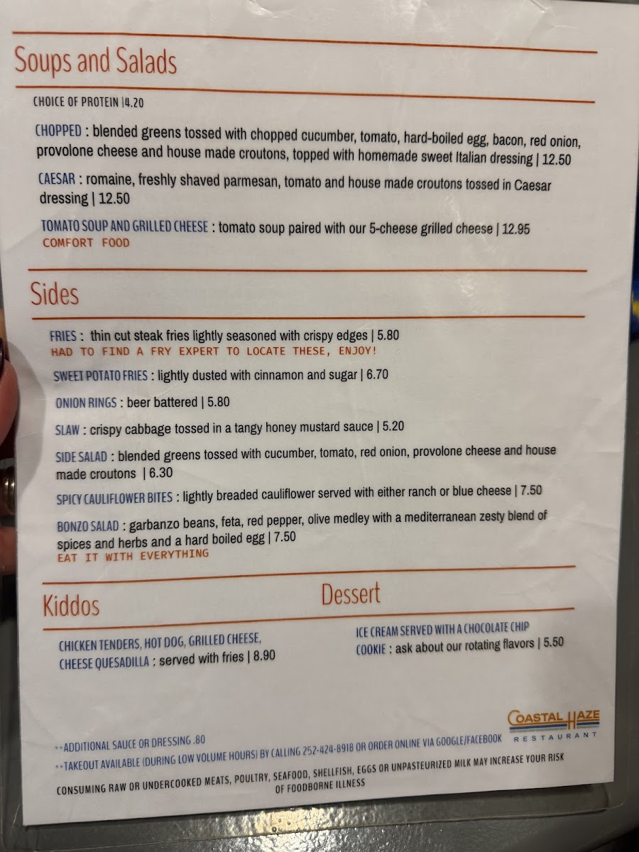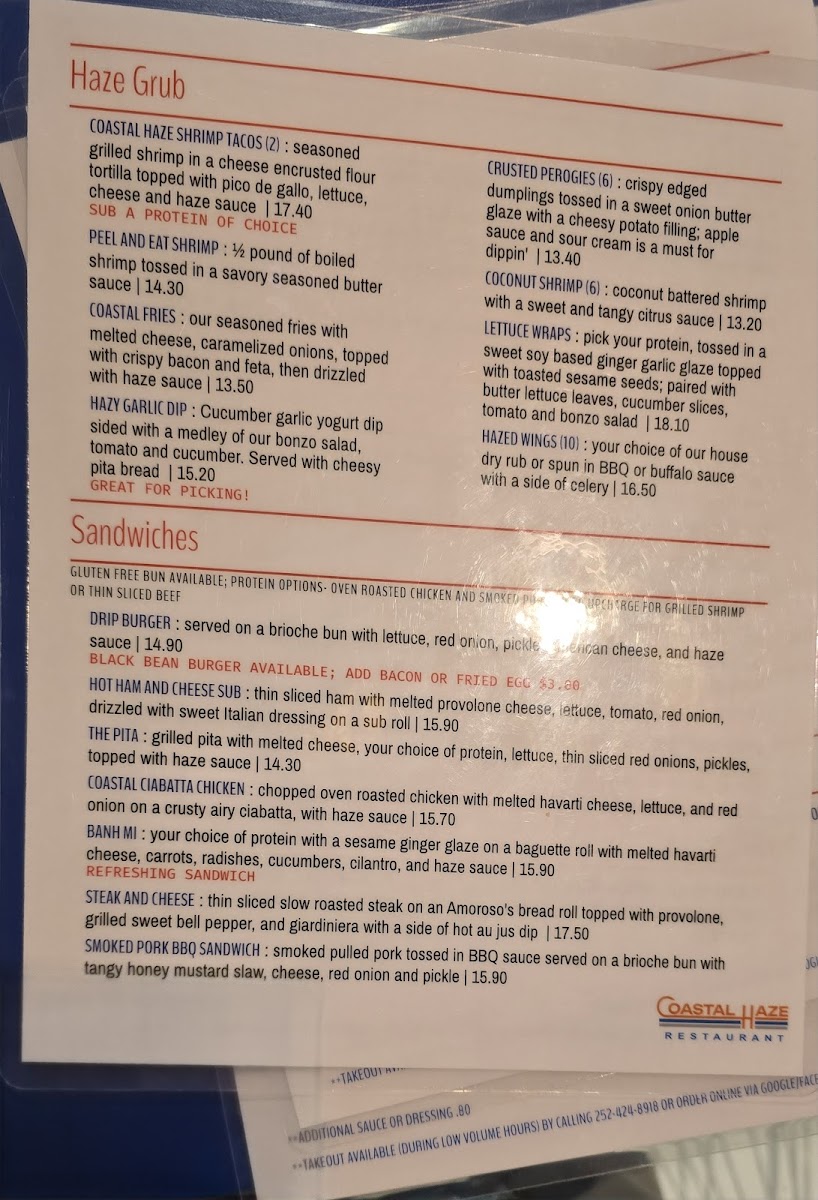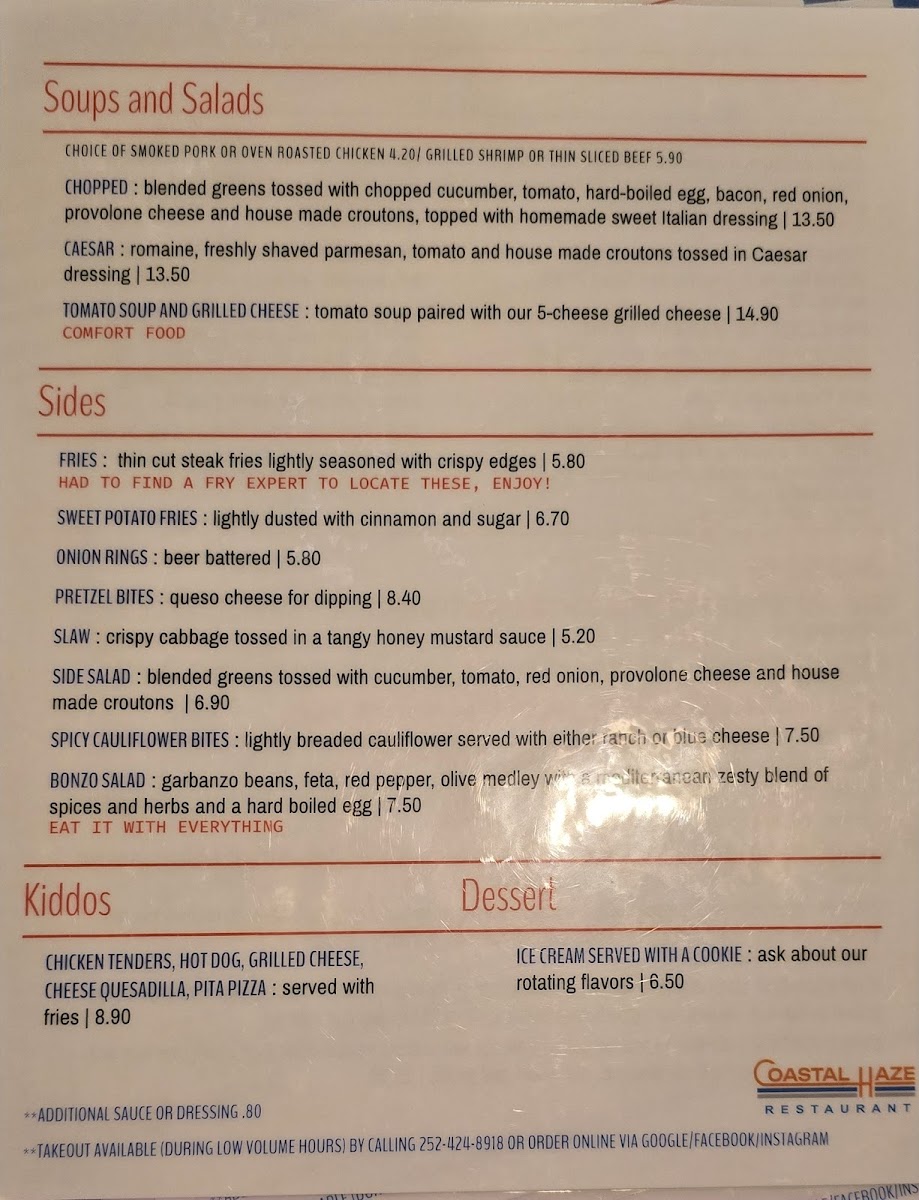 At Coastal Haze Restaurant Menu, you’ll find a perfect mix of coastal flavors and local ingredients, making every meal a celebration of fresh, vibrant dishes. Located in Cape Carteret, North Carolina, this charming spot offers a variety of options designed to satisfy every taste. Whether you're craving a light seafood dish or something heartier, their menu has something for everyone.